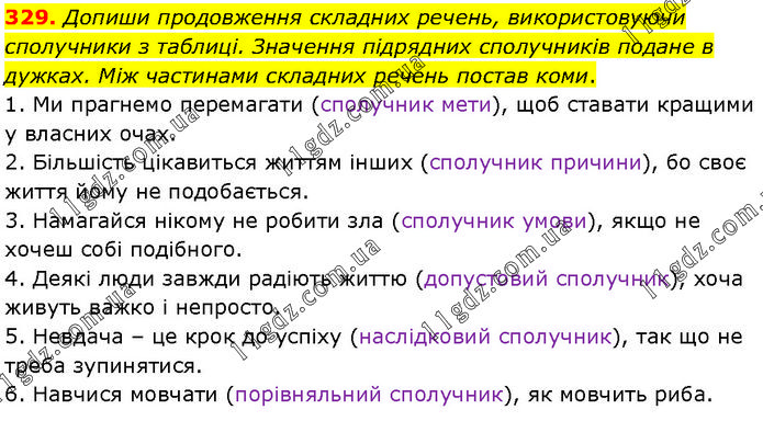 Допиши продовження складних речень, використовуючи сполучники з таблиці. Значення підрядних сполучників подане в дужках. Між частинами складних речень постав коми. 1. Ми прагнемо перемагати (сполучник мети), щоб ставати кращими у власних очах. 2. Більшість цікавиться життям інших (сполучник причини), бо своє життя йому не подобається. 3. Намагайся нікому не робити зла (сполучник умови), якщо не хочеш собі подібного. 4. Деякі люди завжди радіють життю (допустовий сполучник), хоча живуть важко і непросто. 5. Невдача – це крок до успіху (наслідковий сполучник), так що не треба зупинятися. 6. Навчися мовчати (порівняльний сполучник), як мовчить риба.