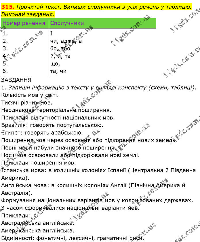 Прочитай текст. Випиши сполучники з усіх речень у таблицю. Виконай завдання. Номер речення Сполучники 1. 2. 3. 4. 5. 6. І чи, адже, а бо, або й, й, та що, та, чи ЗАВДАННЯ 1. Запиши інформацію з тексту у вигляді конспекту (схеми, таблиці). Кількість мов у світі. Тисячі різних мов. Неоднакове територіальне поширення. Приклади відсутності національних мов. Бразилія: говорять португальською. Єгипет: говорять арабською. Поширення мов через освоєння або підкорення нових земель. Певні мови набули значного поширення. Носії мов освоювали або підкорювали нові землі. Приклади поширення мов. Іспанська мова: в колишніх колоніях Іспанії (Центральна й Південна Америка). Англійська мова: в колишніх колоніях Англії (Північна Америка й Австралія). Формування національних варіантів мов у колонізованих державах. З часом сформувалися національні варіанти мов. Приклади: Австралійська англійська. Американська англійська. Відмінності: фонетичні, лексичні, граматичні риси.