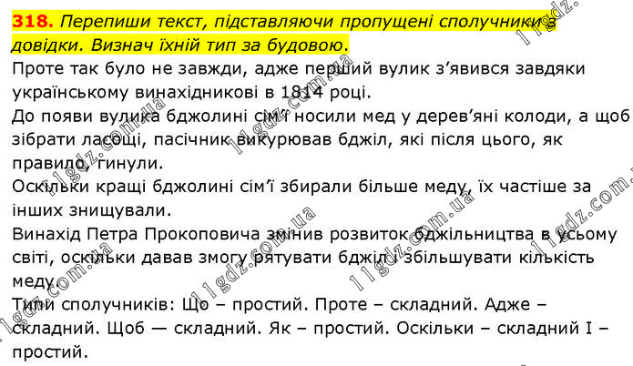 Перепиши текст, підставляючи пропущені сполучники з довідки. Визнач їхній тип за будовою. Проте так було не завжди, адже перший вулик з’явився завдяки українському винахідникові в 1814 році. До появи вулика бджолині сім’ї носили мед у дерев’яні колоди, а щоб зібрати ласощі, пасічник викурював бджіл, які після цього, як правило, гинули. Оскільки кращі бджолині сім’ї збирали більше меду, їх частіше за інших знищували. Винахід Петра Прокоповича змінив розвиток бджільництва в усьому світі, оскільки давав змогу рятувати бджіл і збільшувати кількість меду. Типи сполучників: Що – простий. Проте – складний. Адже – складний. Щоб — складний. Як – простий. Оскільки – складний І – простий.