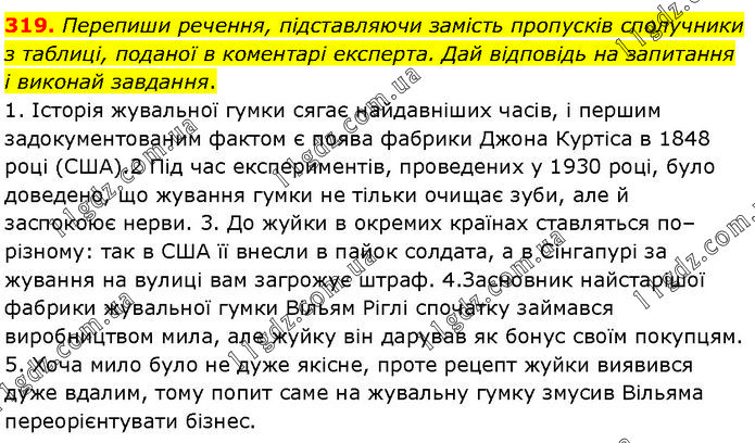 Перепиши речення, підставляючи замість пропусків сполучники з таблиці, поданої в коментарі експерта. Дай відповідь на запитання і виконай завдання. 1. Історія жувальної гумки сягає найдавніших часів, і першим задокументованим фактом є поява фабрики Джона Куртіса в 1848 році (США).2 Під час експериментів, проведених у 1930 році, було доведено, що жування гумки не тільки очищає зуби, але й заспокоює нерви. 3. До жуйки в окремих країнах ставляться по–різному: так в США її внесли в пайок солдата, а в Сінгапурі за жування на вулиці вам загрожує штраф. 4.Засновник найстарішої фабрики жувальної гумки Вільям Ріглі спочатку займався виробництвом мила, але жуйку він дарував як бонус своїм покупцям. 5. Хоча мило було не дуже якісне, проте рецепт жуйки виявився дуже вдалим, тому попит саме на жувальну гумку змусив Вільяма переорієнтувати бізнес.