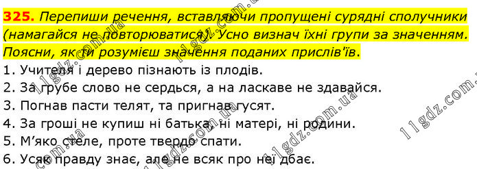 Перепиши речення, вставляючи пропущені сурядні сполучники (намагайся не повторюватися). Усно визнач їхні групи за значенням. Поясни, як ти розумієш значення поданих прислів'їв. 1. Учителя і дерево пізнають із плодів. 2. За грубе слово не сердься, а на ласкаве не здавайся. 3. Погнав пасти телят, та пригнав гусят. 4. За гроші не купиш ні батька, ні матері, ні родини. 5. М’яко стеле, проте твердо спати. 6. Усяк правду знає, але не всяк про неї дбає.
