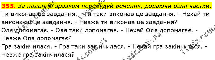 За поданим зразком перебудуй речення, додаючи різні частки. Ти виконав це завдання. - Ти таки виконав це завдання. - Нехай ти виконаєш це завдання. - Невже ти виконав це завдання? Оля допомагає. - Оля таки допомагає. - Нехай Оля допомагає. - Невже Оля допомагає? Гра закінчилася. - Гра таки закінчилася. - Нехай гра закінчиться. - Невже гра закінчилася?