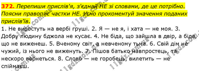 Перепиши прислів'я, з'єднай НЕ зі словами, де це потрібно. Поясни правопис частки НЕ. Усно прокоментуй значення поданих прислів'їв. 1. Не виростуть на вербі груші. 2. Я — не я, і хата — не моя. 3. Добру людину бджола не кусає. 4. Не біда, що зайшла в двір, а біда, що не виженеш. 5. Вченому світ, а невченому тьма. 6. Свій дім не чужий, із нього не виженуть. 7. Пішов батько навпростець, та нескоро вернеться. 8. Слово — не горобець, вилетить — не спіймаєш.