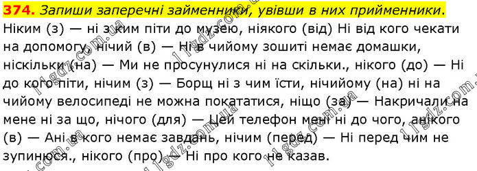 Запиши заперечні займенники, увівши в них прийменники. Ніким (з) — ні з ким піти до музею, ніякого (від) Ні від кого чекати на допомогу, нічий (в) — Ні в чийому зошиті немає домашки, ніскільки (на) — Ми не просунулися ні на скільки., нікого (до) — Ні до кого піти, нічим (з) — Борщ ні з чим їсти, нічийому (на) ні на чийому велосипеді не можна покататися, ніщо (за) — Накричали на мене ні за що, нічого (для) — Цей телефон мені ні до чого, анікого (в) — Ані в кого немає завдань, нічим (перед) — Ні перед чим не зупинюся., нікого (про) — Ні про кого не казав.
