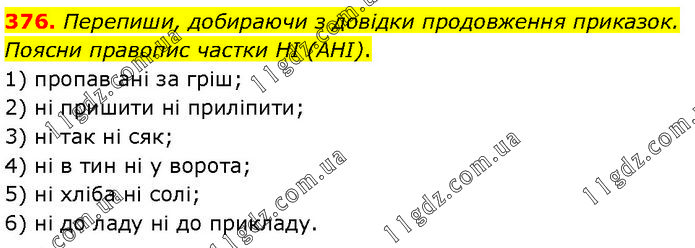 Перепиши, добираючи з довідки продовження приказок. Поясни правопис частки НІ (АНІ). 1) пропав ані за гріш; 2) ні пришити ні приліпити; 3) ні так ні сяк; 4) ні в тин ні у ворота; 5) ні хліба ні солі; 6) ні до ладу ні до прикладу.