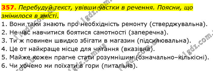 Перебудуй текст, увівши частки в речення. Поясни, що змінилося в змісті. 1. Вони таки знають про необхідність ремонту (стверджувальна). 2. Не час навчитися боятися самотності (заперечна). 3. Ти ж повинен швидко збігати в магазин (підсилювальна). 4. Це от найкраще місце для читання (вказівна). 5. Майже кожен прагне стати розумнішим (означально–кількісні). 6. Чи хочемо ми поїхати в гори (питальна).