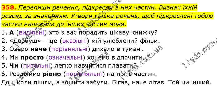Перепиши речення, підкресли в них частки. Визнач їхній розряд за значенням. Утвори кілька речень, щоб підкреслені тобою частки належали до інших частин мови. 1. А (видільні) хто з вас порадить цікаву книжку? 2. «Довбуш» – це (вказівні) мій улюблений фільм. 3. Озеро наче (порівняльні) дихало в тумані. 4. Ми просто (означальні) хочемо відпочити. 5. Чи (питальні) легко навчитися плавати? 6. Розділимо рівно (порівняльні) на п’ять частин. До школи пішли, а зошити забули. Бігав, наче літав. Той чи інший.