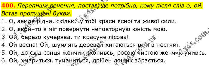 Перепиши речення, постав, де потрібно, кому після слів о, ой. Встав пропущені букви. 1. О, земле рідна, скільки у тобі краси ясної та живої сили. 2. О, якби–то я міг повернути неповторную юність мою. 3. Ой, березо кучерява, ти красуне лісова! 4. Ой весна! Ой, шумлять дерева і хитаються віти в нестямі. 5. Ой, до схід сонця женчик схопивсь, росою чистою женчик умивсь. 6. Ой, хмариться, туманиться, дрібен дощик збрається.