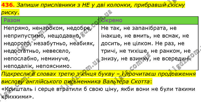 Запиши прислівники з НЕ у дві колонки, прибравши скісну риску. Разом Окремо Непрямо, ненароком, недобре, неприпустимо, нещодавно, недорого, незабутньо, неабияк, недостатньо, невесело, непослабно, неминуче, неподалік, непояснимо. Не так, не запанібрата, не інакше, не вмить, не всмак, не досить, не цілком. Не раз, не тричі, не тихіше, не ранком, не знизу, не взимку, не всередині. Підкресли в словах третю з кінця букву – і прочитаєш продовження вислову англійського письменника Вальтера Скотта: «Кришталь і серце втратили б свою ціну, якби вони не були такими крихкими».