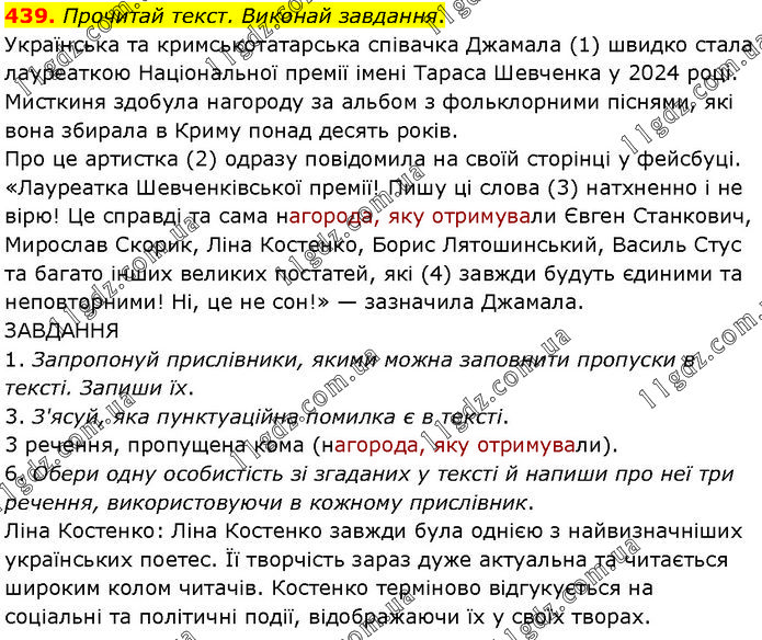 Прочитай текст. Виконай завдання. Українська та кримськотатарська співачка Джамала (1) швидко стала лауреаткою Національної премії імені Тараса Шевченка у 2024 році. Мисткиня здобула нагороду за альбом з фольклорними піснями, які вона збирала в Криму понад десять років. Про це артистка (2) одразу повідомила на своїй сторінці у фейсбуці. «Лауреатка Шевченківської премії! Пишу ці слова (3) натхненно і не вірю! Це справді та сама нагорода, яку отримували Євген Станкович, Мирослав Скорик, Ліна Костенко, Борис Лятошинський, Василь Стус та багато інших великих постатей, які (4) завжди будуть єдиними та неповторними! Ні, це не сон!» — зазначила Джамала. ЗАВДАННЯ 1. Запропонуй прислівники, якими можна заповнити пропуски в тексті. Запиши їх. 3. З'ясуй, яка пунктуаційна помилка є в тексті. 3 речення, пропущена кома (нагорода, яку отримували). 6. Обери одну особистість зі згаданих у тексті й напиши про неї три речення, використовуючи в кожному прислівник. Ліна Костенко: Ліна Костенко завжди була однією з найвизначніших українських поетес. Її творчість зараз дуже актуальна та читається широким колом читачів. Костенко терміново відгукується на соціальні та політичні події, відображаючи їх у своїх творах.
