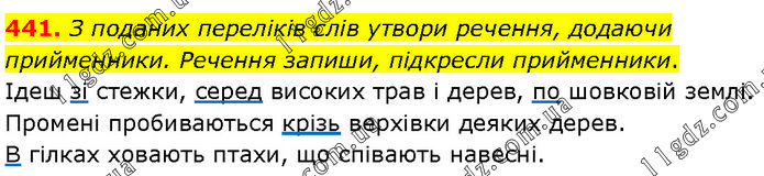 З поданих переліків слів утвори речення, додаючи прийменники. Речення запиши, підкресли прийменники. Ідеш зі стежки, серед високих трав і дерев, по шовковій землі. Промені пробиваються крізь верхівки деяких дерев. В гілках ховають птахи, що співають навесні.
