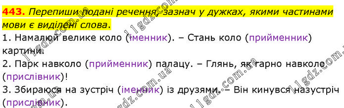 Перепиши подані речення, зазнач у дужках, якими частинами мови є виділені слова. 1. Намалюй велике коло (іменник). – Стань коло (прийменник) картини. 2. Парк навколо (прийменник) палацу. – Глянь, як гарно навколо (прислівник)! 3. Збираюся на зустріч (іменник) із друзями. – Він кинувся назустріч (прислівник).