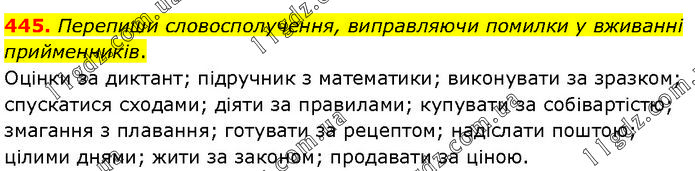 Перепиши словосполучення, виправляючи помилки у вживанні прийменників. Оцінки за диктант; підручник з математики; виконувати за зразком; спускатися сходами; діяти за правилами; купувати за собівартістю; змагання з плавання; готувати за рецептом; надіслати поштою; цілими днями; жити за законом; продавати за ціною.