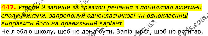 Утвори й запиши за зразком речення з помилково вжитими сполучниками, запропонуй однокласникові чи однокласниці виправити його на правильний варіант. Не люблю школу, щоб не дома бути. Запізнився, щоб не встигав.