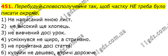 Перебудуй словосполучення так, щоб частку НЕ треба було писати окремо. 1) Не написаний мною лист. 2) не високий ще хлопець. 3) не вивчений досі урок. 4) усміхнувся не щиро, а стримано. 5) не прочитана досі стаття. 6) купили не дешево, втричі дорожче.