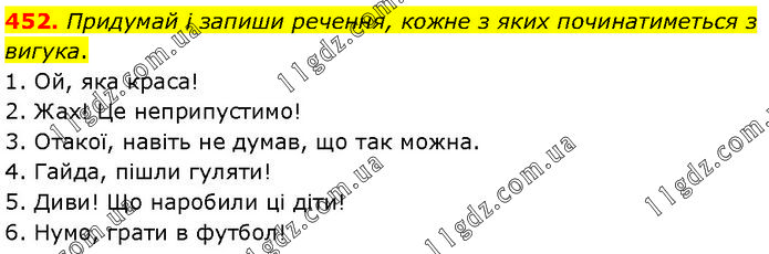 Придумай і запиши речення, кожне з яких починатиметься з вигука. 1. Ой, яка краса! 2. Жах! Це неприпустимо! 3. Отакої, навіть не думав, що так можна. 4. Гайда, пішли гуляти! 5. Диви! Що наробили ці діти! 6. Нумо, грати в футбол!