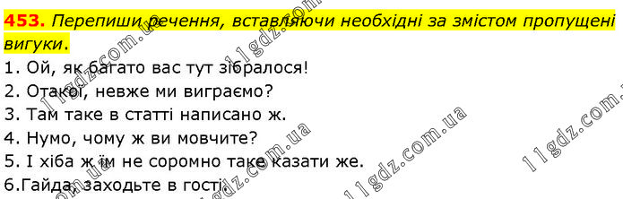 Перепиши речення, вставляючи необхідні за змістом пропущені вигуки. 1. Ой, як багато вас тут зібралося! 2. Отакої, невже ми виграємо? 3. Там таке в статті написано ж. 4. Нумо, чому ж ви мовчите? 5. І хіба ж їм не соромно таке казати же. 6.Гайда, заходьте в гості.