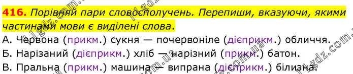 Порівняй пари словосполучень. Перепиши, вказуючи, якими частинами мови є виділені слова. А. Червона (прикм.) сукня — почервоніле (дієприкм.) обличчя. Б. Нарізаний (дієприкм.) хліб — нарізний (прикм.) батон. В. Пральна (прикм.) машина — випрана (дієприкм.) білизна.