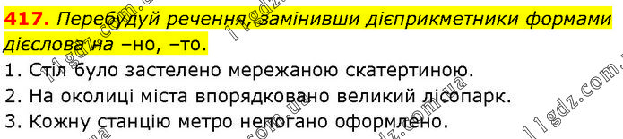Перебудуй речення, замінивши дієприкметники формами дієслова на –но, –то. 1. Стіл було застелено мережаною скатертиною. 2. На околиці міста впорядковано великий лісопарк. 3. Кожну станцію метро непогано оформлено.