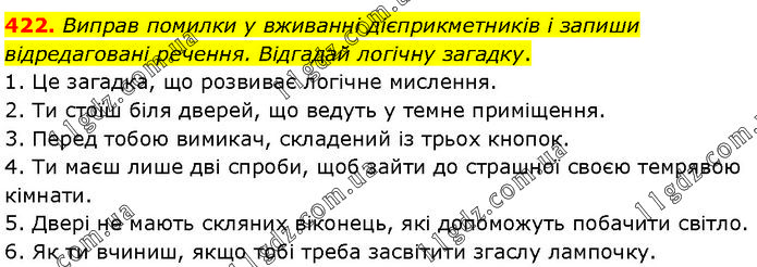 Виправ помилки у вживанні дієприкметників і запиши відредаговані речення. Відгадай логічну загадку. 1. Це загадка, що розвиває логічне мислення. 2. Ти стоїш біля дверей, що ведуть у темне приміщення. 3. Перед тобою вимикач, складений із трьох кнопок. 4. Ти маєш лише дві спроби, щоб зайти до страшної своєю темрявою кімнати. 5. Двері не мають скляних віконець, які допоможуть побачити світло. 6. Як ти вчиниш, якщо тобі треба засвітити згаслу лампочку.