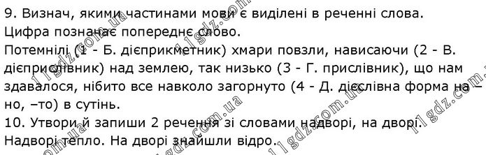 9. Визнач, якими частинами мови є виділені в реченні слова. Цифра позначає попереднє слово. Потемнілі (1 - Б. дієприкметник) хмари повзли, нависаючи (2 - В. дієприслівник) над землею, так низько (3 - Г. прислівник), що нам здавалося, нібито все навколо загорнуто (4 - Д. дієслівна форма на –но, –то) в сутінь. 10. Утвори й запиши 2 речення зі словами надворі, на дворі. Надворі тепло. На дворі знайшли відро.
