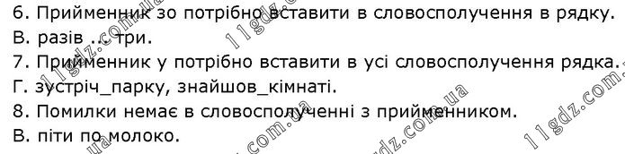6. Прийменник зо потрібно вставити в словосполучення в рядку. В. разів ... три. 7. Прийменник у потрібно вставити в усі словосполучення рядка. Г. зустріч_парку, знайшов_кімнаті. 8. Помилки немає в словосполученні з прийменником. В. піти по молоко.