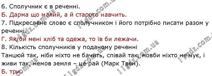 6. Сполучник є в реченні. Б. Дарма що малий, а й старого навчить. 7. Підкреслене слово є сполучником і його потрібно писати разом у реченні. Г. Як/би мені хліб та одежа, то їв би лежачи. 8. Кількість сполучників у поданому реченні Танцюй так, ніби ніхто не бачить, співай так, мовби ніхто не чує, і живи так, немов земля – це рай (Марк Твен). Б. три.