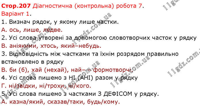 Діагностична (контрольна) робота 7. Варіант 1. 1. Визнач рядок, у якому лише частки. А. ось, лише, ледве. 2. Усі слова утворені за допомогою словотворчих часток у рядку В. аніякими, хтось, який–небудь. 3. Відповідність між частками та їхнім розрядом правильно встановлено в рядку В. би (б), хай (нехай), най– – формотворчі. 4. Усі слова пишемо з НІ (АНІ) разом у рядку Г. ні/звідки, ні/трохи, ні/кого. 5. Усі слова пишемо з частками З ДЕФІСОМ у рядку. А. казна/який, сказав/таки, будь/кому.