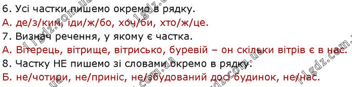 6. Усі частки пишемо окремо в рядку. А. де/з/ким, іди/ж/бо, хоч/би, хто/ж/це. 7. Визнач речення, у якому є частка. А. Вітерець, вітрище, вітрисько, буревій – он скільки вітрів є в нас. 8. Частку НЕ пишемо зі словами окремо в рядку. Б. не/чотири, не/приніс, не/збудований досі будинок, не/нас.