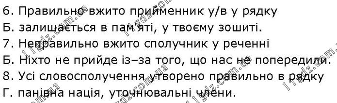 6. Правильно вжито прийменник у/в у рядку Б. залишається в пам'яті, у твоєму зошиті. 7. Неправильно вжито сполучник у реченні Б. Ніхто не прийде із–за того, що нас не попередили. 8. Усі словосполучення утворено правильно в рядку Г. панівна нація, уточнювальні члени.