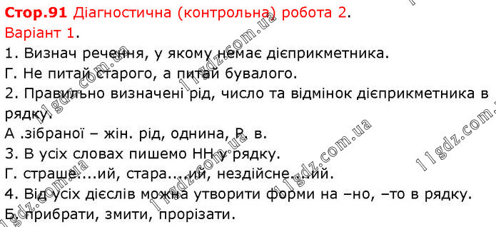 Стор.91 Діагностична (контрольна) робота 2. Варіант 1. 1. Визнач речення, у якому немає дієприкметника. Г. Не питай старого, а питай бувалого. 2. Правильно визначені рід, число та відмінок дієприкметника в рядку. А .зібраної – жін. рід, однина, Р. в. 3. В усіх словах пишемо НН у рядку. Г. страше....ий, стара....ий, нездійсне....ий. 4. Від усіх дієслів можна утворити форми на –но, –то в рядку. Б. прибрати, змити, прорізати.