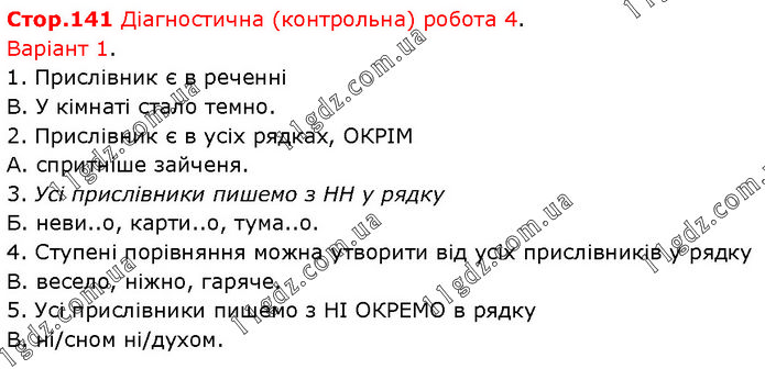Діагностична (контрольна) робота 4. Варіант 1. 1. Прислівник є в реченні В. У кімнаті стало темно. 2. Прислівник є в усіх рядках, ОКРІМ А. спритніше зайченя. 3. Усі прислівники пишемо з НН у рядку Б. неви..о, карти..о, тума..о. 4. Ступені порівняння можна утворити від усіх прислівників у рядку В. весело, ніжно, гаряче. 5. Усі прислівники пишемо з НІ ОКРЕМО в рядку В. ні/сном ні/духом.