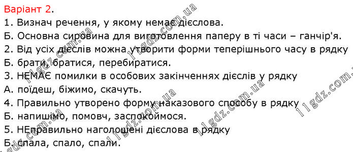 Варіант 2. 1. Визнач речення, у якому немає дієслова. Б. Основна сировина для виготовлення паперу в ті часи – ганчір'я. 2. Від усіх дієслів можна утворити форми теперішнього часу в рядку Б. брати, братися, перебиратися. 3. НЕМАЄ помилки в особових закінченнях дієслів у рядку А. поїдеш, біжимо, скачуть. 4. Правильно утворено форму наказового способу в рядку Б. напишімо, помовч, заспокоймося. 5. НЕправильно наголошені дієслова в рядку Б. спала, спало, спали.