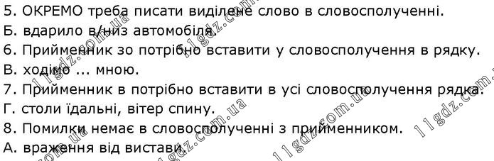 5. ОКРЕМО треба писати виділене слово в словосполученні. Б. вдарило в/низ автомобіля. 6. Прийменник зо потрібно вставити у словосполучення в рядку. В. ходімо ... мною. 7. Прийменник в потрібно вставити в усі словосполучення рядка. Г. столи їдальні, вітер спину. 8. Помилки немає в словосполученні з прийменником. А. враження від вистави.