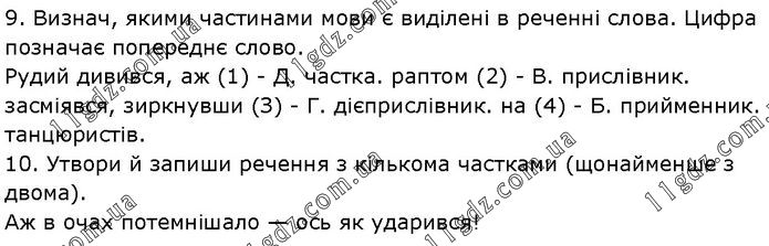 9. Визнач, якими частинами мови є виділені в реченні слова. Цифра позначає попереднє слово. Рудий дивився, аж (1) - Д. частка. раптом (2) - В. прислівник. засміявся, зиркнувши (З) - Г. дієприслівник. на (4) - Б. прийменник. танцюристів. 10. Утвори й запиши речення з кількома частками (щонайменше з двома). Аж в очах потемнішало — ось як ударився!
