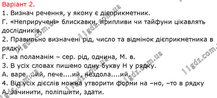 Варіант 2. 1. Визнач речення, у якому є дієприкметник. Г. «Неприручені» блискавки, припливи чи тайфуни цікавлять дослідників. 2. Правильно визначені рід, число та відмінок дієприкметника в рядку Г. на поламанім – сер. рід, однина, М. в. 3. В усіх словах пишемо одну букву Н у рядку. А. варе....ий, пече....ий, нездола....ий. 4. Від усіх дієслів можна утворити форми на –но, –то в рядку А. зачинити, поліпшити, здати.