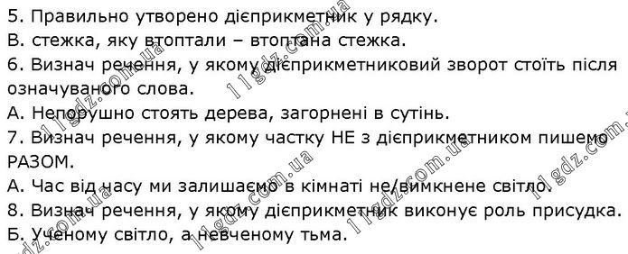 5. Правильно утворено дієприкметник у рядку. В. стежка, яку втоптали – втоптана стежка. 6. Визнач речення, у якому дієприкметниковий зворот стоїть після означуваного слова. А. Непорушно стоять дерева, загорнені в сутінь. 7. Визнач речення, у якому частку НЕ з дієприкметником пишемо РАЗОМ. А. Час від часу ми залишаємо в кімнаті не/вимкнене світло. 8. Визнач речення, у якому дієприкметник виконує роль присудка. Б. Ученому світло, а невченому тьма.
