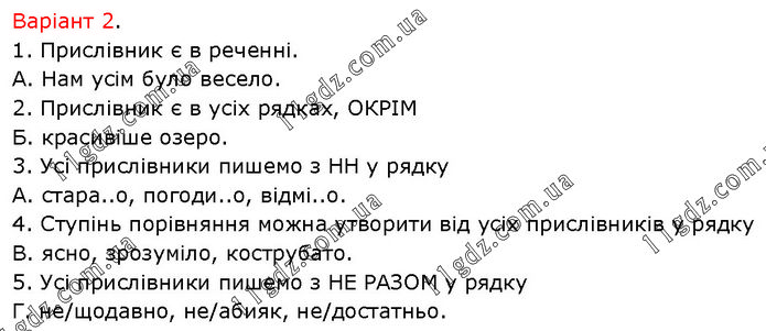 Варіант 2. 1. Прислівник є в реченні. А. Нам усім було весело. 2. Прислівник є в усіх рядках, ОКРІМ Б. красивіше озеро. 3. Усі прислівники пишемо з НН у рядку А. стара..о, погоди..о, відмі..о. 4. Ступінь порівняння можна утворити від усіх прислівників у рядку В. ясно, зрозуміло, кострубато. 5. Усі прислівники пишемо з НЕ РАЗОМ у рядку Г. не/щодавно, не/абияк, не/достатньо.