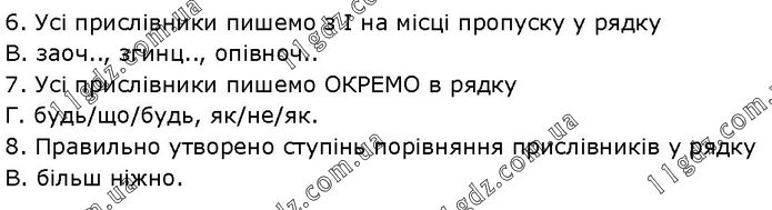 6. Усі прислівники пишемо з І на місці пропуску у рядку В. заоч.., згинц.., опівноч.. 7. Усі прислівники пишемо ОКРЕМО в рядку Г. будь/що/будь, як/не/як. 8. Правильно утворено ступінь порівняння прислівників у рядку В. більш ніжно.
