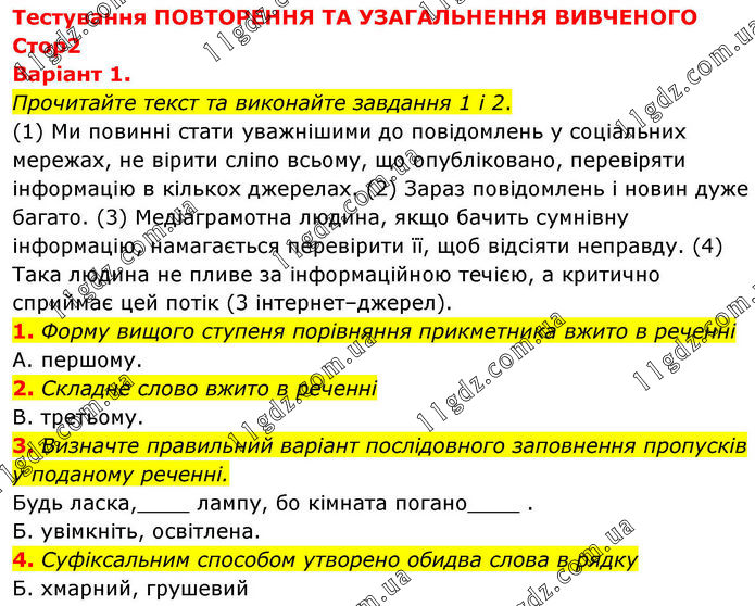 Тестування ПОВТОРЕННЯ ТА УЗАГАЛЬНЕННЯ ВИВЧЕНОГО Стор.2 Варіант 1. Прочитайте текст та виконайте завдання 1 і 2. (1) Ми повинні стати уважнішими до повідомлень у соціальних мережах, не вірити сліпо всьому, що опубліковано, перевіряти інформацію в кількох джерелах. (2) Зараз повідомлень і новин дуже багато. (3) Медіаграмотна людина, якщо бачить сумнівну інформацію, намагається перевірити її, щоб відсіяти неправду. (4) Така людина не пливе за інформаційною течією, а критично сприймає цей потік (3 інтернет–джерел). 1. Форму вищого ступеня порівняння прикметника вжито в реченні А. першому. 2. Складне слово вжито в реченні В. третьому. 3. Визначте правильний варіант послідовного заповнення пропусків у поданому реченні. Будь ласка,____ лампу, бо кімната погано____ . Б. увімкніть, освітлена. 4. Суфіксальним способом утворено обидва слова в рядку Б. хмарний, грушевий.