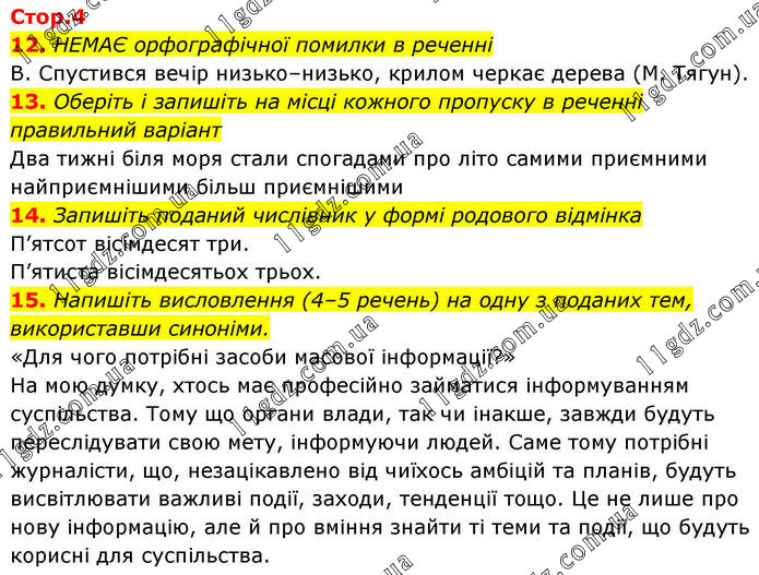 12. НЕМАЄ орфографічної помилки в реченні В. Спустився вечір низько–низько, крилом черкає дерева (М. Тягун). 13. Оберіть і запишіть на місці кожного пропуску в реченні правильний варіант Два тижні біля моря стали спогадами про літо самими приємними найприємнішими більш приємнішими 14. Запишіть поданий числівник у формі родового відмінка П’ятсот вісімдесят три. П’ятиста вісімдесятьох трьох. 15. Напишіть висловлення (4–5 речень) на одну з поданих тем, використавши синоніми. «Для чого потрібні засоби масової інформації?» На мою думку, хтось має професійно займатися інформуванням суспільства. Тому що органи влади, так чи інакше, завжди будуть переслідувати свою мету, інформуючи людей. Саме тому потрібні журналісти, що, незацікавлено від чиїхось амбіцій та планів, будуть висвітлювати важливі події, заходи, тенденції тощо. Це не лише про нову інформацію, але й про вміння знайти ті теми та події, що будуть корисні для суспільства.
