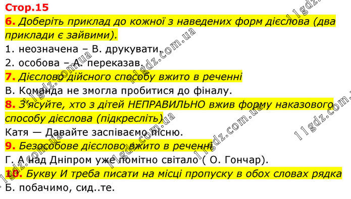 6. Доберіть приклад до кожної з наведених форм дієслова (два приклади є зайвими). 1. неозначена – В. друкувати. 2. особова – А. переказав. 7. Дієслово дійсного способу вжито в реченні В. Команда не змогла пробитися до фіналу. 8. З’ясуйте, хто з дітей НЕПРАВИЛЬНО вжив форму наказового способу дієслова (підкресліть) Катя — Давайте заспіваємо пісню. 9. Безособове дієслово вжито в реченні Г. А над Дніпром уже помітно світало ( О. Гончар). 10. Букву И треба писати на місці пропуску в обох словах рядка Б. побачимо, сид..те.