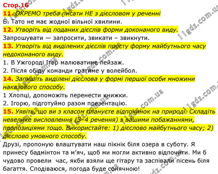 11. ОКРЕМО треба писати НЕ з дієсловом у реченні Б. Тато не має жодної вільної хвилини. 12. Утворіть від поданих дієслів форми доконаного виду. Запрошувати — запросити, звикати – звикнути. 13. Утворіть від виділених дієслів просту форму майбутнього часу недоконаного виду. 1. В Ужгороді Ігор малюватиме пейзаж. 2. Після обіду команди гратиме у волейбол. 14. Запишіть виділені дієслова у формі першої особи множини наказового способу. 1 Хлопці, допоможіть перенести книжки. 2. Ігорю, підготуймо разом презентацію. 15. Уявіть, що ви з класом плануєте відпочинок на природі. Складіть невелике висловлення (3–4 речення) з вашими побажаннями, пропозиціями тощо. Використайте: 1) дієслово майбутнього часу; 2) дієслово умовного способу. Друзі, пропоную влаштувати наш пікнік біля озера в суботу. Я принесу бадмінтон та м’яч, щоб ми могли активно відпочити. Ми б чудово провели час, якби взяли ще гітару та заспівали пісень біля багаття. Сподіваюся, погода буде сонячною!