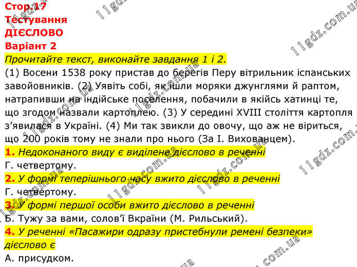 Тестування ДІЄСЛОВО Варіант 2 Прочитайте текст, виконайте завдання 1 і 2. (1) Восени 1538 року пристав до берегів Перу вітрильник іспанських завойовників. (2) Уявіть собі, як ішли моряки джунглями й раптом, натрапивши на індійське поселення, побачили в якійсь хатинці те, що згодом назвали картоплею. (3) У середині XVIII століття картопля з’явилася в Україні. (4) Ми так звикли до овочу, що аж не віриться, що 200 років тому не знали про нього (За І. Вихованцем). 1. Недоконаного виду є виділене дієслово в реченні Г. четвертому. 2. У формі теперішнього часу вжито дієслово в реченні Г. четвертому. 3. У формі першої особи вжито дієслово в реченні Б. Тужу за вами, солов’ї Вкраїни (М. Рильський). 4. У реченні «Пасажири одразу пристебнули ремені безпеки» дієслово є А. присудком.