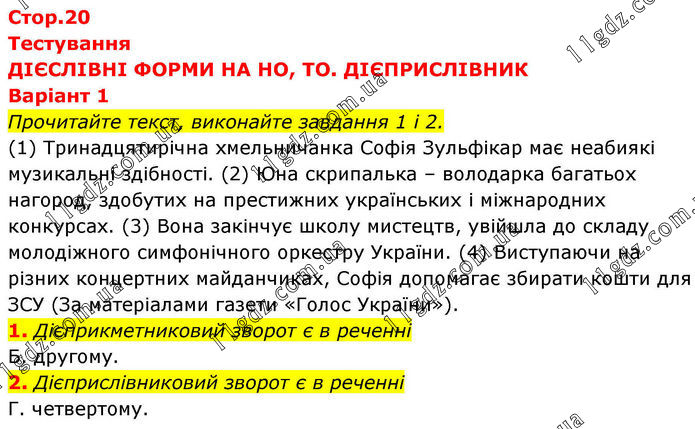 Тестування ДІЄСЛІВНІ ФОРМИ НА НО, ТО. ДІЄПРИСЛІВНИК Варіант 1 Прочитайте текст, виконайте завдання 1 і 2. (1) Тринадцятирічна хмельничанка Софія Зульфікар має неабиякі музикальні здібності. (2) Юна скрипалька – володарка багатьох нагород, здобутих на престижних українських і міжнародних конкурсах. (3) Вона закінчує школу мистецтв, увійшла до складу молодіжного симфонічного оркестру України. (4) Виступаючи на різних концертних майданчиках, Софія допомагає збирати кошти для ЗСУ (За матеріалами газети «Голос України»). 1. Дієприкметниковий зворот є в реченні Б. другому. 2. Дієприслівниковий зворот є в реченні Г. четвертому.