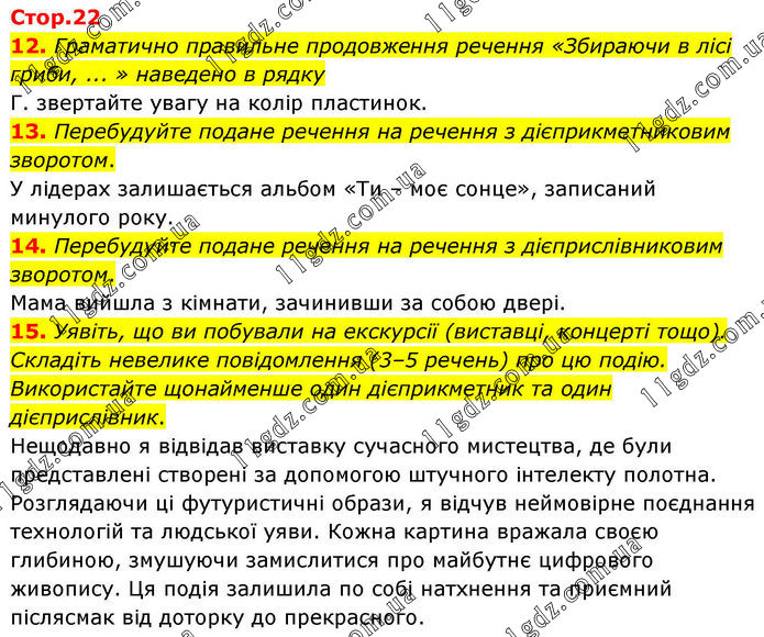12. Граматично правильне продовження речення «Збираючи в лісі гриби, ... » наведено в рядку Г. звертайте увагу на колір пластинок. 13. Перебудуйте подане речення на речення з дієприкметниковим зворотом. У лідерах залишається альбом «Ти – моє сонце», записаний минулого року. 14. Перебудуйте подане речення на речення з дієприслівниковим зворотом. Мама вийшла з кімнати, зачинивши за собою двері. 15. Уявіть, що ви побували на екскурсії (виставці, концерті тощо). Складіть невелике повідомлення (3–5 речень) про цю подію. Використайте щонайменше один дієприкметник та один дієприслівник. Нещодавно я відвідав виставку сучасного мистецтва, де були представлені створені за допомогою штучного інтелекту полотна. Розглядаючи ці футуристичні образи, я відчув неймовірне поєднання технологій та людської уяви. Кожна картина вражала своєю глибиною, змушуючи замислитися про майбутнє цифрового живопису. Ця подія залишила по собі натхнення та приємний післясмак від доторку до прекрасного.