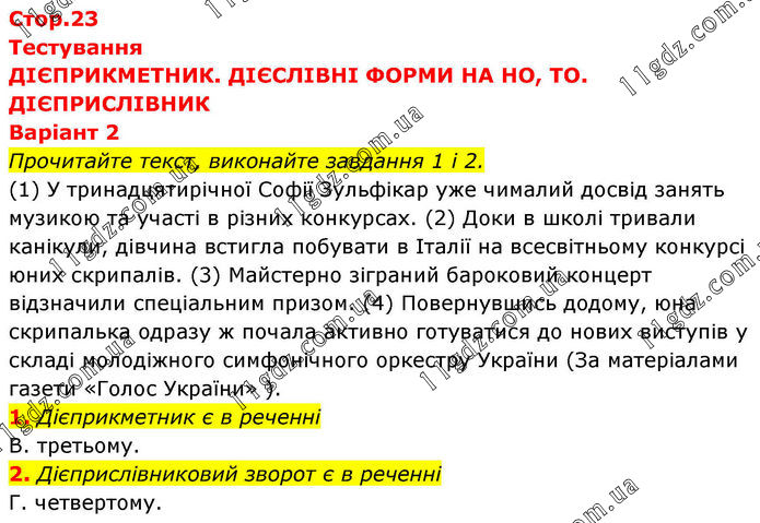 Тестування ДІЄПРИКМЕТНИК. ДІЄСЛІВНІ ФОРМИ НА НО, ТО. ДІЄПРИСЛІВНИК Варіант 2 Прочитайте текст, виконайте завдання 1 і 2. (1) У тринадцятирічної Софії Зульфікар уже чималий досвід занять музикою та участі в різних конкурсах. (2) Доки в школі тривали канікули, дівчина встигла побувати в Італії на всесвітньому конкурсі юних скрипалів. (3) Майстерно зіграний бароковий концерт відзначили спеціальним призом. (4) Повернувшись додому, юна скрипалька одразу ж почала активно готуватися до нових виступів у складі молодіжного симфонічного оркестру України (За матеріалами газети «Голос України» ). 1. Дієприкметник є в реченні В. третьому. 2. Дієприслівниковий зворот є в реченні Г. четвертому.