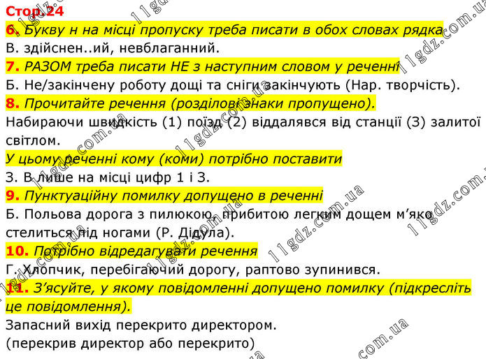 6. Букву н на місці пропуску треба писати в обох словах рядка В. здійснен..ий, невблаганний. 7. РАЗОМ треба писати НЕ з наступним словом у реченні Б. Не/закінчену роботу дощі та сніги закінчують (Нар. творчість). 8. Прочитайте речення (розділові знаки пропущено). Набираючи швидкість (1) поїзд (2) віддалявся від станції (З) залитої світлом. У цьому реченні кому (коми) потрібно поставити З. В лише на місці цифр 1 і З. 9. Пунктуаційну помилку допущено в реченні Б. Польова дорога з пилюкою, прибитою легким дощем м’яко стелиться під ногами (Р. Дідула). 10. Потрібно відредагувати речення Г. Хлопчик, перебігаючий дорогу, раптово зупинився. 11. З’ясуйте, у якому повідомленні допущено помилку (підкресліть це повідомлення). Запасний вихід перекрито директором. (перекрив директор або перекрито)