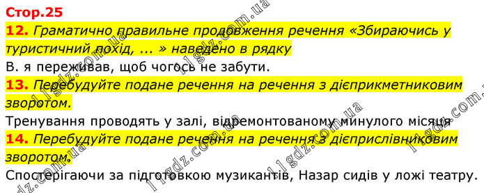 12. Граматично правильне продовження речення «Збираючись у туристичний похід, ... » наведено в рядку В. я переживав, щоб чогось не забути. 13. Перебудуйте подане речення на речення з дієприкметниковим зворотом. Тренування проводять у залі, відремонтованому минулого місяця 14. Перебудуйте подане речення на речення з дієприслівниковим зворотом. Спостерігаючи за підготовкою музикантів, Назар сидів у ложі театру.