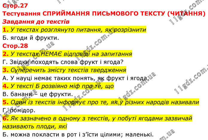 Тестування СПРИЙМАННЯ ПИСЬМОВОГО ТЕКСТУ (ЧИТАННЯ) Завдання до текстів 1. У текстах розглянуто питання, як розрізнити Б. ягоди й фрукти. Стор.28 2. У текстах НЕМАЄ відповіді на запитання Г. Звідки походять слова фрукт і ягода? 3. Суперечить змісту текстів твердження А. У науці немає таких понять, як фрукт і ягода. 4. У тексті Б розвіяно міф про те, що В. банани – це фрукти. 5. Один із текстів інформує про те, як у різних народів називали Г. помідор. 6. Як зазначено в одному з текстів, у побуті ягодами зазвичай називають плоди, які Б. можна покласти в рот і з’їсти цілими; маленькі.